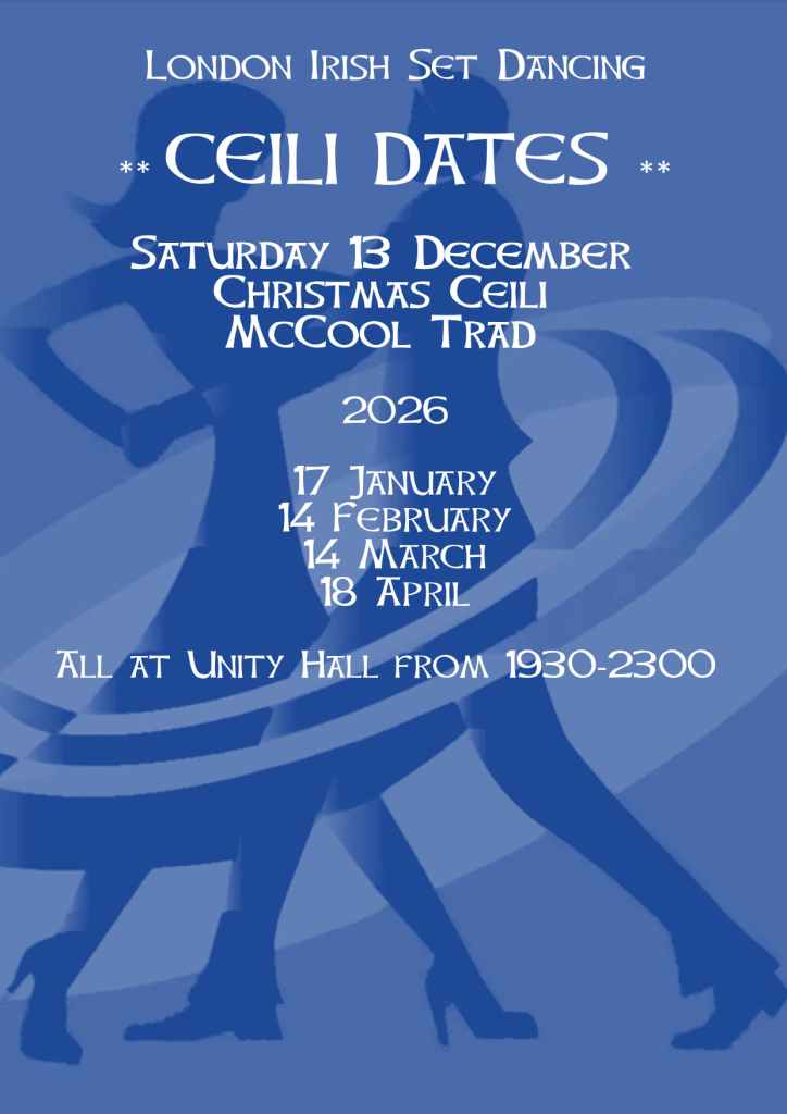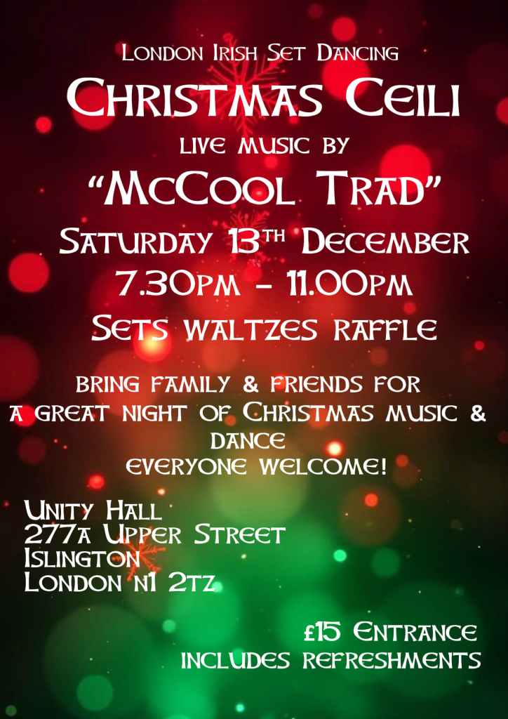Our next ceili is on Saturday 13 December – Christmas is just around the corner so take a break from the shopping and come and have a dance. See the flyer below and come along for some great quality music and dancing.